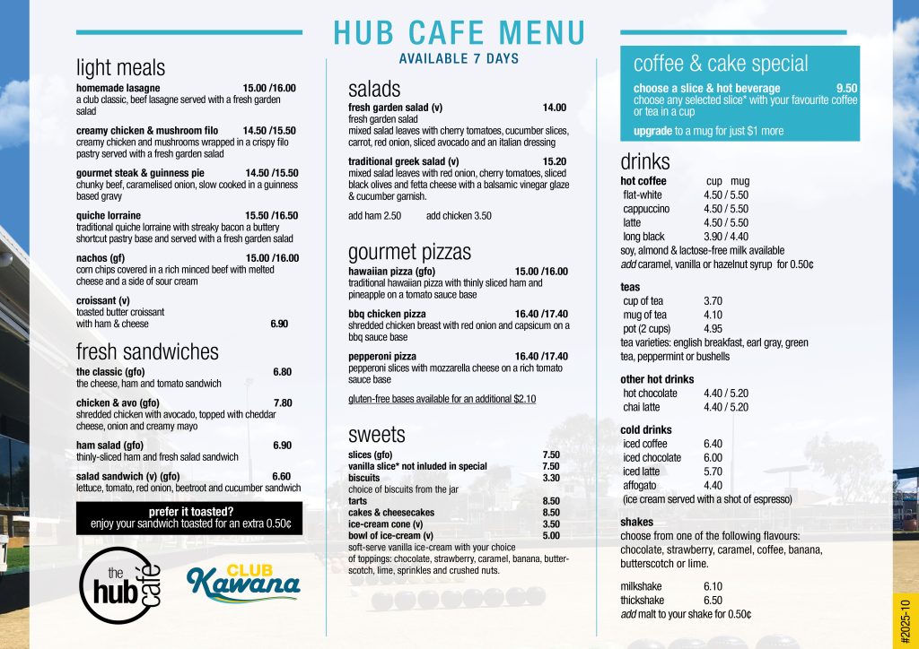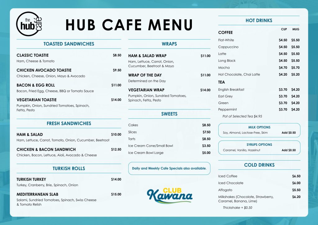 The Hub Cafe at Club Kawana offers a range of light meals, fresh sandwiches, toasties, pizzas, sweets as well as hot and cold drinks.